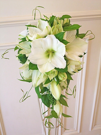 キャスケードは小さな滝のように縦長に流れていくのが特徴でオーバルはふっくらとした楕円形です。豪華で正統派のスタイルは教会式でもたれることが多い王道なブーケです。