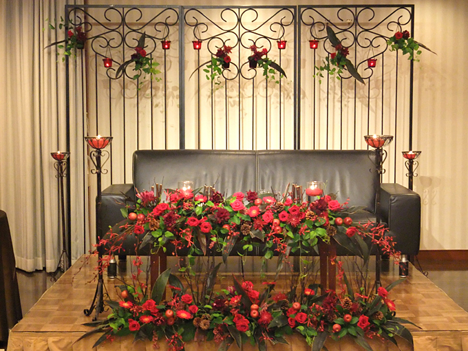 マツカサや姫リンゴをガラスの花器にいれて秋らしさを演出しています。 枝をたくさん使い、赤のインパクトある色にナチュラル感を加え ゴージャスにデザインしました。 ソファーテーブルを使用するメインテーブルは、この会場のオリジナルで 堅苦しくないパーティーを希望する新郎・新婦には好評です。
