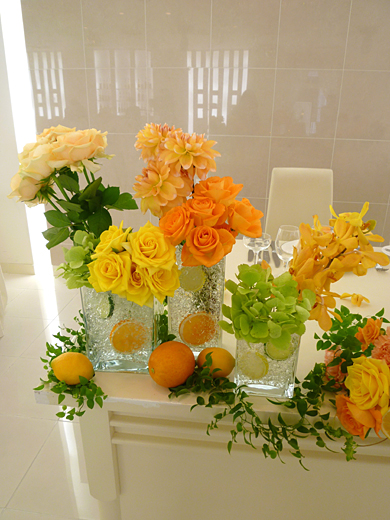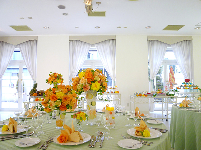 キュートで元気いっぱいのビタミンカラーの花々を使い、 フルーツとコラボレーションしました。 真っ白な会場に、色とりどりの色彩がはえて 陽気で明るく、見ているだけで楽しいパーティーが想像出来ます。 ガラス花器にいれたゼリーの演出効果が、 デザートのようなイメージにもコーディネート出来ました。
